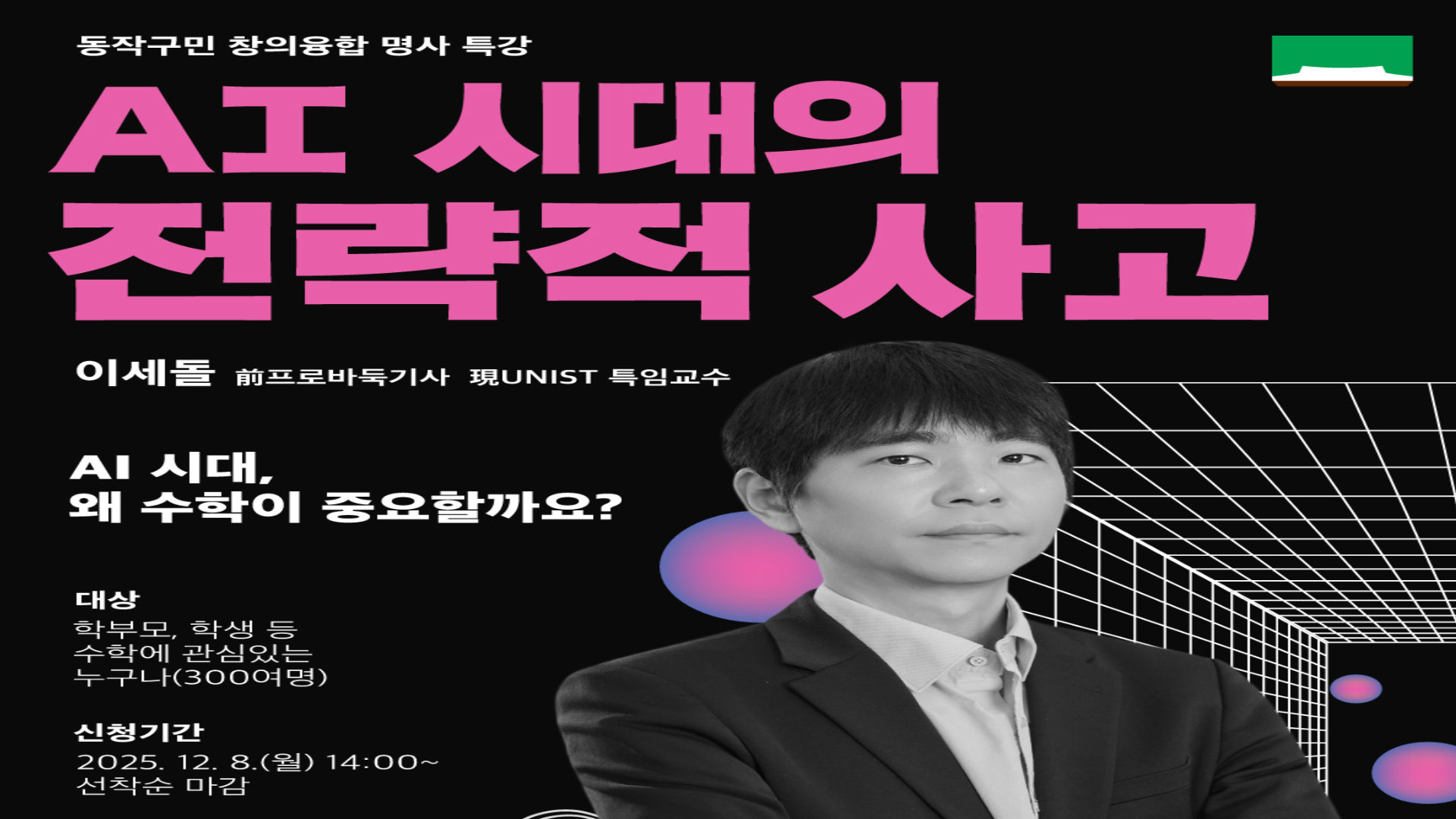 AI시대를 살아가는 우리에게 필요한 다음 수는 무엇일까요?세계적인 바둑기사 이세돌 교수와 함께 미래를 여는 전략적 사고를 살펴볼 수 있는특별한 ..